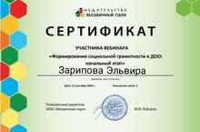 Сертификат участника вебинара "Формирование социальной грамотности в ДОО: начальный этап" Зарипова Эльвира заведующая детского сада 21.09.2023