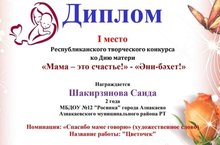 Победитель конкурса редакции " Маяк " г.Азнакаево.Воспитанница МБДОУ " Детский сад" № 12 " Росинка " подготовительной к школе группы Шарафутдинова Дания стала призером в фотоконкурсе ко Дню Матери от редакции " Маяк "в номинации " Моя Любимая Мама" 12нче " Росинка " балалар бакчасында мәктәпкә әзерлек төркемендә тәрбияләнүче Шәрәфетдинова Дания Әниләр көненә " Маяк " редакциясеннән үткәрелгән фотоконкурста " Минем Яраткан Әнием " номинациясендә призёр булды. 02.12.2022