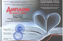 Диплом дипломанта2 степени Кабиров Раян .Региональный конкурс художественного чтения"Не жалейте слов хороших" 16.03.2022