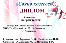 Республиканский национальный детский театральный фестиваль "Сэхнэ көзгесе" Диплом 1 степени награждается театральный коллектив "Вдохновение" МБДОУ №12 "Росинка" Руководители: Зарипова Э.М., Насибуллина И.И., Халимова Г.А., Хадиева Ф.С., Наушиева Г.Р. 20.02.2020