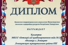 Диплом Приикское территориальное управление Министерства экологии и природных ресурсов РТ. Награждает коллектив за активное участие в конкурсе "Волшебные превращение" 13.03.2017
