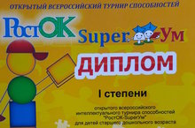 Участие детей подготовительной к школе группы в "Открытом всероссийском турнире сппособностей РостОК Super Ум". 1 степень -Ильясова Назиля, Палтаев Тимур, Бадрутдинова Рамиля, Измайлова Амина, 2 степень - Халимова Динара, Хакимова Амалия, Осипова Луиза, 3 степень - Фатхуллин Радель. Поздравляем! 27.12.2016