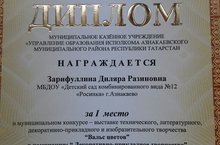 Награждается воспитатель Зарифуллина Диляра Разиновна за I место в муниципальном конкурсе: "Вальс цветов" в номинации "Декоративно - прикладное творчество". 11.11.2016