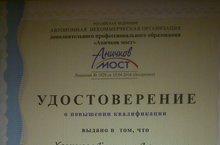 Наши педагоги получили Удостоверение о повышении квалификации на тему "Обновление содержания дошкольного образования в соответствиис ФГОС ДО" Руководитель автономной некоммерческой организации дополнительного профессионального образования "Аничков мост" А.И.Буренина. г. Санкт Петербург. 24.11.2016