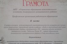 Грамота за 2 место смотра-конкурса худ.самодеятельности по концерному жанру среди ДОУ города и района повященного 130- летнему юбилею Г.Тукая, 85-летию образования Азнакаевского муниципального района и Году российского кино. 29.06.2016