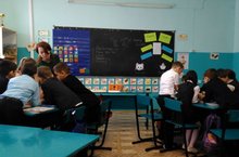 Во время перемен учащиеся имели возможность смотреть мультфильмы на английском языке.