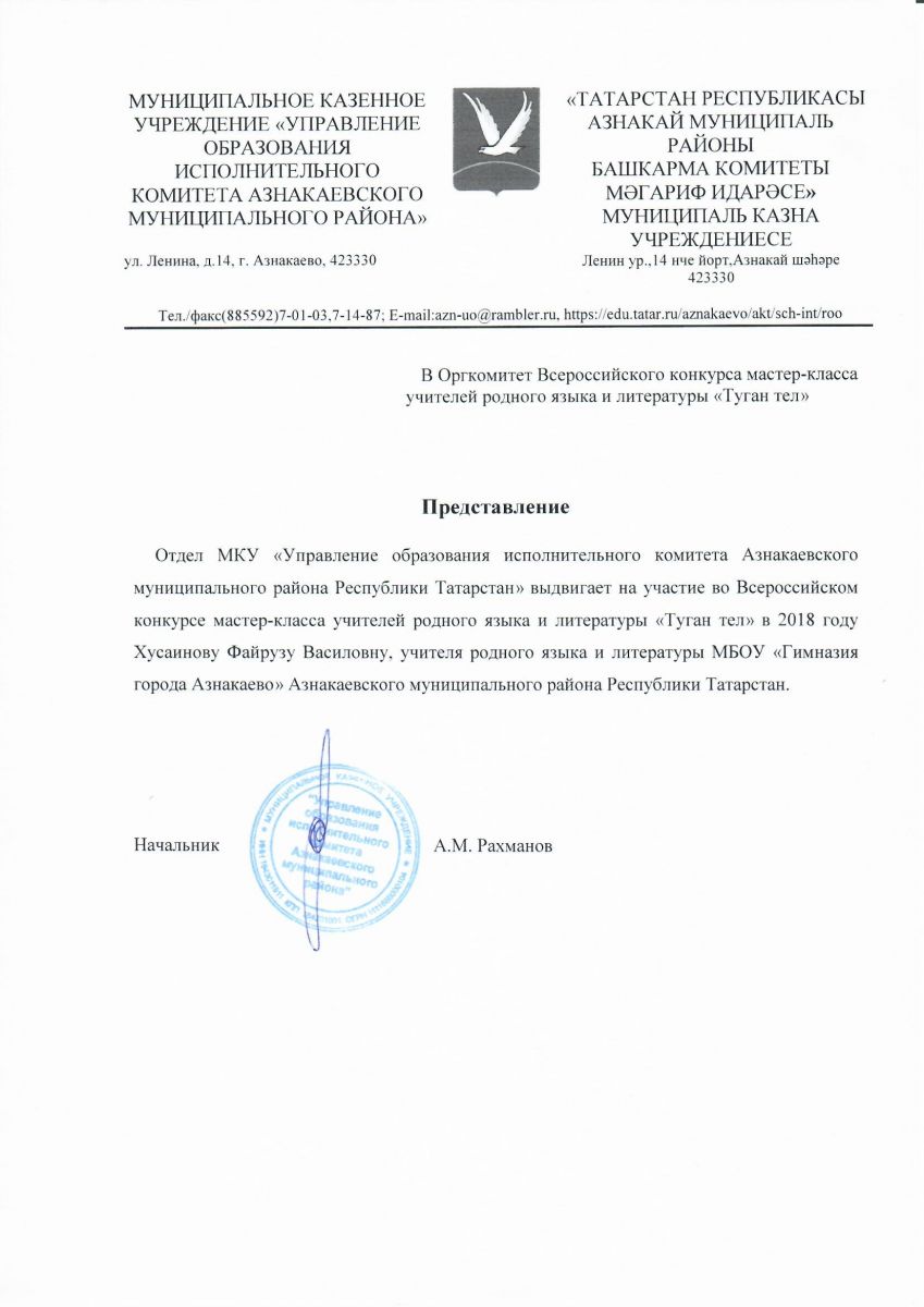 Представление на участие в Конкурсе от муниципальных органов управления образованием Республики Татарстан