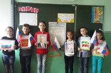 Воспитанники пришкольного лагеря совместно с вожатыми раздавали жителям ленточки с российским триколором.