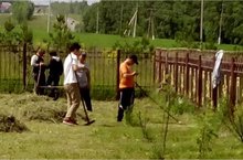 Лагерь труда и отдыха «Энергия» на уборке пришкольной территории. -