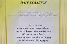 Директор школы, Хамидуллин Гаяз Музагитович, принял участие в массовом забеге «Кросс наций-2018» и занял 2 место на дистанции 1200 метров. Отличный результат! Так держать!