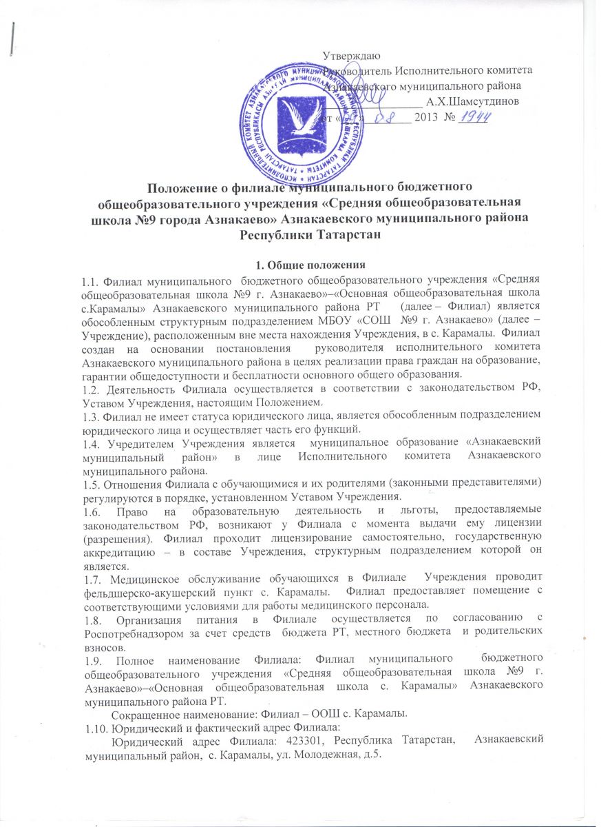 Положение о филиале МБОУ"СОШ №9 г.Азнакаево"-"Основная общеобразовательная школа с.Карамалы"