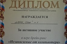 6 апреля команда учащихся 7А класса нашей школы приняли участие в брейн-ринге "Независимые от компьютера" и получили диплом за активное участие.