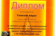 Гилязов Айрат, командир школьного отряда "ФЛЭШ" проекта "СМС дети", удостоился диплома МОиН РТ за активное участие на Республиканской профильной смене антинаркотического проекта "Самостоятельные дети" с 28 по 30 марта 2016 года. Желаем дальнейших творческих успехов и активной деятельности!!!