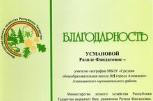 Министерство лесного хозяйства Республики Татарстан выразило нашему учителю географии Усмановой Разиле Фандасовне благодарность за многолетнюю плодотворную работу по экологическому образованию школьников совместно с государственным природным заказником "Чатыр-Тау". Поздравляем!