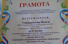 Поздравляем Габдракипову Илюзу! Она заняла 2 место в муниципальном конкурсе-выставке декоративно-прикладного, технического и литературного творчества "Зимние фантазии" в номинации "Декоративно-прикладное творчество" в своей возрастной группе (руководитель Гарипова Г.Д.)