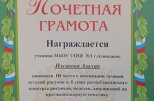 Ученица 5А класса Ихсанова Азалия, заняла 3 место в номинации "Лучший детский рисунок" в первом этапе республиканского конкурса рисунков, поделок, аппликаций на противопожарную тематику.
