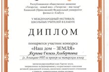 Учитель истории Якупова Г.А. награждена дипломом V Международного фестиваля школьных учителей в г.Елабуга за участие в конкурсе "Наш дом - ЗЕМЛЯ", пропагандирующий идеи Хартии земли. ПОЗДРАВЛЯЕМ!