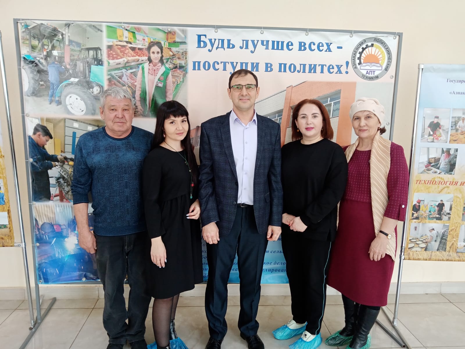 29 мартта 1-2 сыйныф укытучылары, 30 нчы мартта 9 нчы сыйныф җитәкчеләре һәм хезмәт укытучылары "Азнакай политех техникумы"нда шәһәр һәм районыбызның башка мәктәп укытучылары белән бергә укучыларга һөнәри юнәлеш бирүнең әһәмияте турында фикер алыштылар. Очрашу барышында укытучылар техникумның уку аудиторияләре, аның лабораторияләре һәм остаханәләре белән таныштылар. Уку барышында үзләштерелүче белгечлекләр һәм һөнәрләр, уку шартлары һәм укучыларның дәрестән тыш тормышы белән таныштылар.