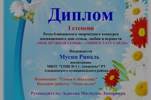 Поздравляем ученика 2 класса Мусина Р. с победой в номинации "Семья в объективе" Республиканского творческого конкурса, посвященного дню семьи, любви и верности "Моя дружная семья". Желаем и в дальнейшем творческих успехов. Руководитель: Асанова М.Л.