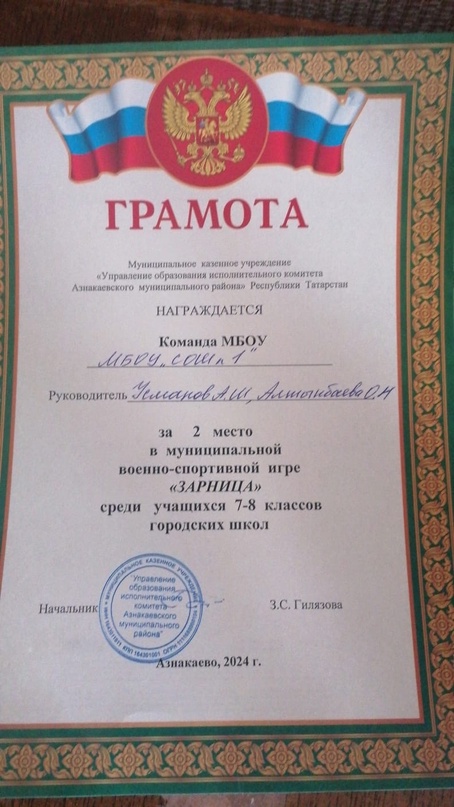 Спорт һәм оборона-массакүләм эш айлыгы кысаларында 5-6 сыйныф укучылары арасында «Азнакай шәһәре гимназиясе» МББУ мәктәбе базасында чираттагы «Зарничка»узды. Безнең команда 1 нче урынны алды! 5а, 5б сыйныф укучыларыбызны котлыйбыз/