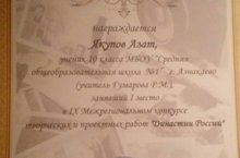 Поздравляем ученика 10 класса Якупова Азата с 1 местом в IX Межрегиональном конкурсе творческих и проектных работ "Династии России" на английском языке. Руководитель - Гумарова Р.М.,учитель английского языка первой квалификационной категории.