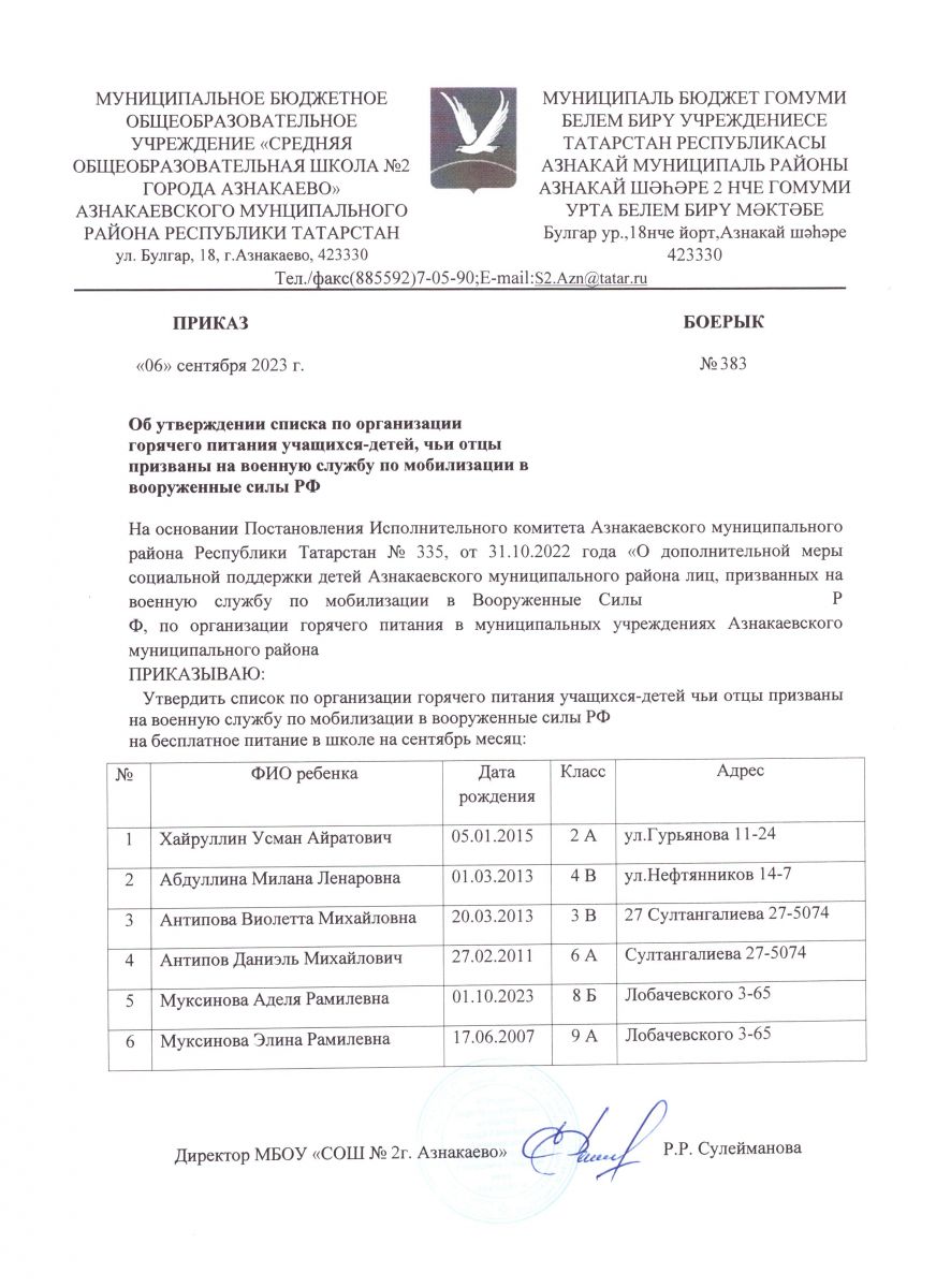 Приказ МБОУ "СОШ №2 г. Азнакаево" от 31.08.2023г. №371 "Об организации горячего питания"