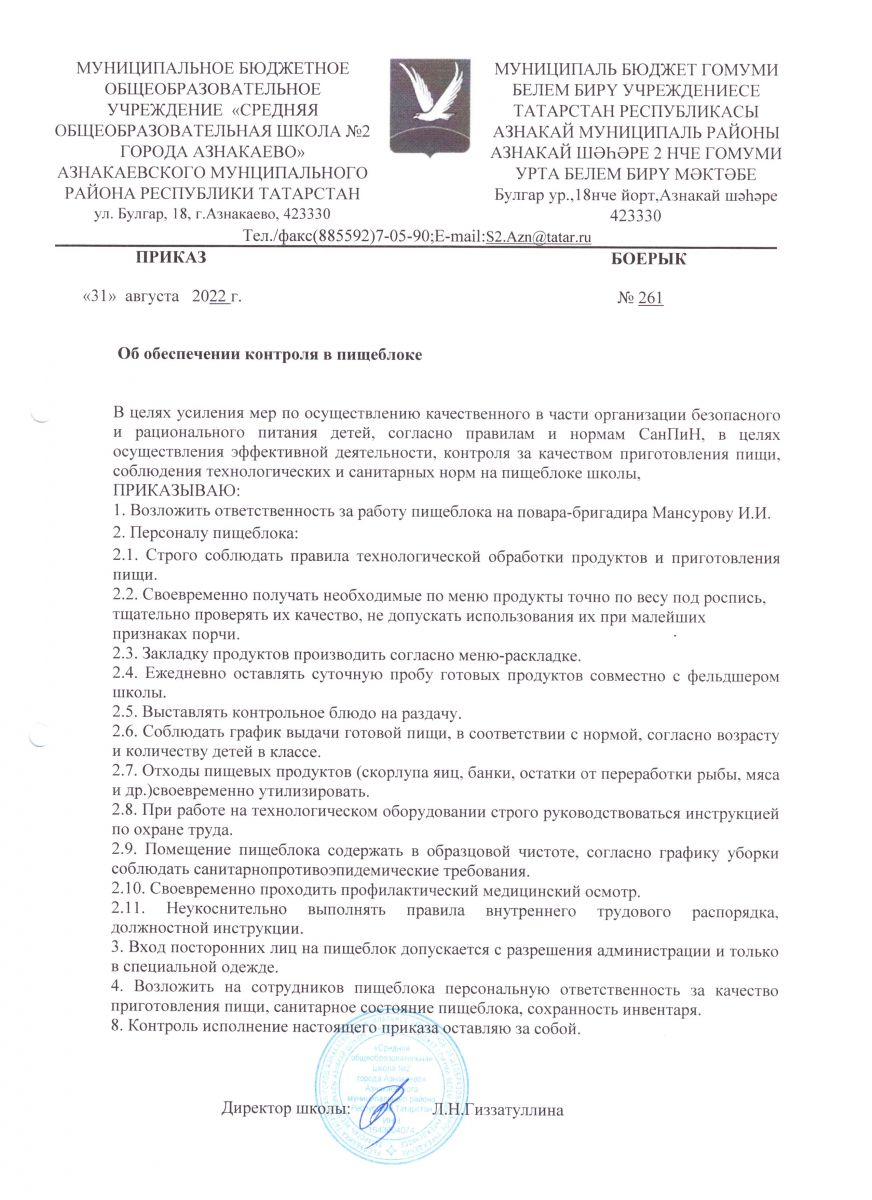 Приказ МБОУ "СОШ №2г.Азнакаево"РТ от 31.08.2022 №261 "Об обеспечении контроля в пищеблоке"
