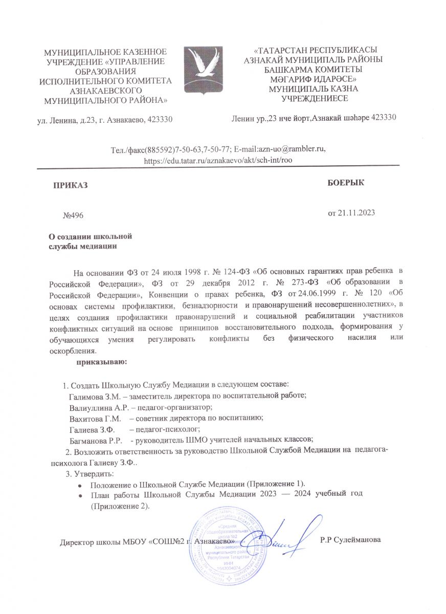Приказ о создании школьной службы медиации