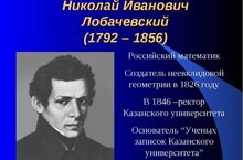 Жизненный путь Николая Ивановича действительно несет в себе много уроков. Он учит нас универсальности – на примере гибкости и многоплановости талантов Лобачевского, а еще смелости, научной прозорливости, несгибаемому достоинству, высокой нравственности и верному служению своему делу. Колоссальное число текущих дел, широкая педагогическая, административная и исследовательская работа не стали препятствием для творческой деятельности математика. Лобачевский Николай Иванович упорно трудился над строгим построением геометрических основ. Результатом столь кропотливого труда стало открытие ученым новой геометрии, совершенное на путях кардинального пересмотра понятий эпохи Евклида (ІІІ век до н. э.).