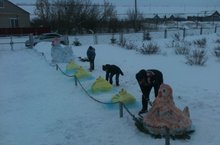 Все классные команды в назначенный день и час дружно начинают работу по заранее заготовленным эскизам, вооруженные гуашью, акварелью, кисточками и разными предметами для строительства из снега. В этом году творческие работы 5 и 8 классов под руководством учителя физкультуры Гимаева Р.Р. удивили всех своей фантазией и объемом работы! -