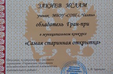 7 класс укучысы Закиев Ислам "Самая старинная открытка" район конкурсында Гран-При га лаек булды. Молодец, Ислам!, Котлыйбыз!