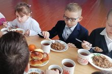 Балалар мәктәп ашханәсендә кайнар аш, тәмле ризыклар белән тукланалар.