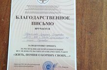 Благодарственное письмо Ибрагимовой Г.Г. За подготовку призера Республиканской конференции "Жить, помня о корнях своих"