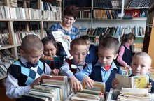 1 класс укучыларын библиотекарь Резеда Анасовна китаплар белән таныштыра, китап сайларга өйрәтә.