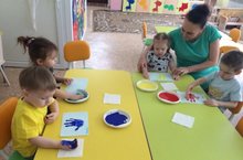Дети первой младшей группы вместе с воспитателем Зилей Талибулловной рисуют ладошками.