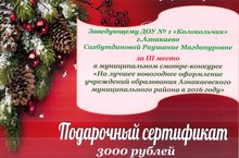 В муниципальном смотре-конкурсе "На лучшее новогоднее оформление учреждений образования Азнакаевского муниципального района в 2016 году" детский сад занял 3 место.