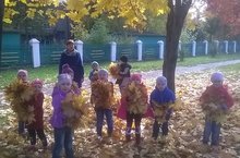 Дети старшей группы на экскурсии любуются красивыми осенними листьями, наблюдают за изменениями в природе.