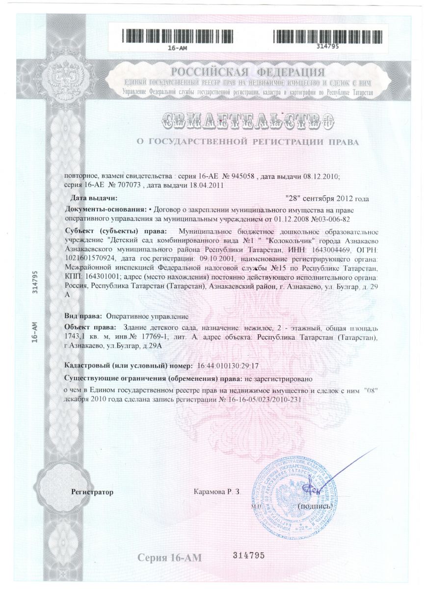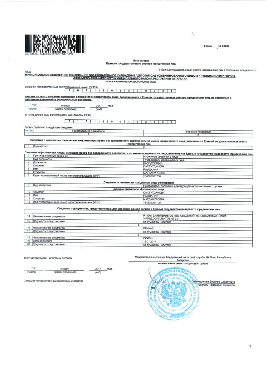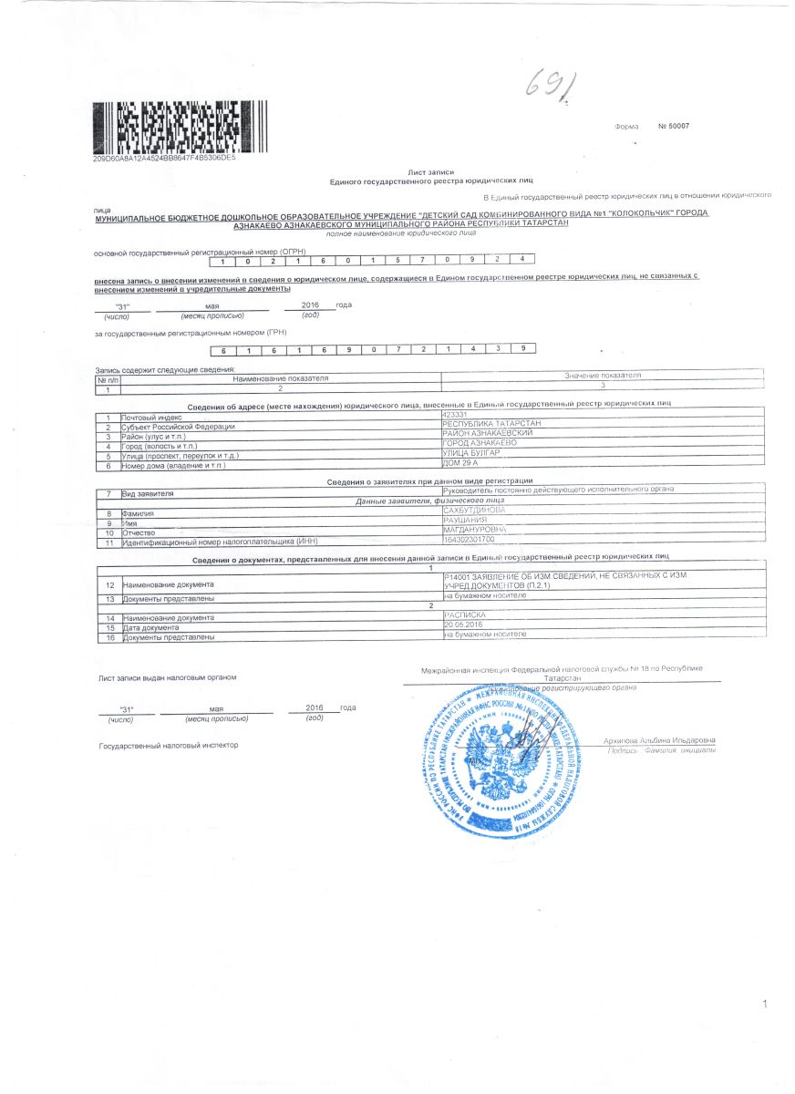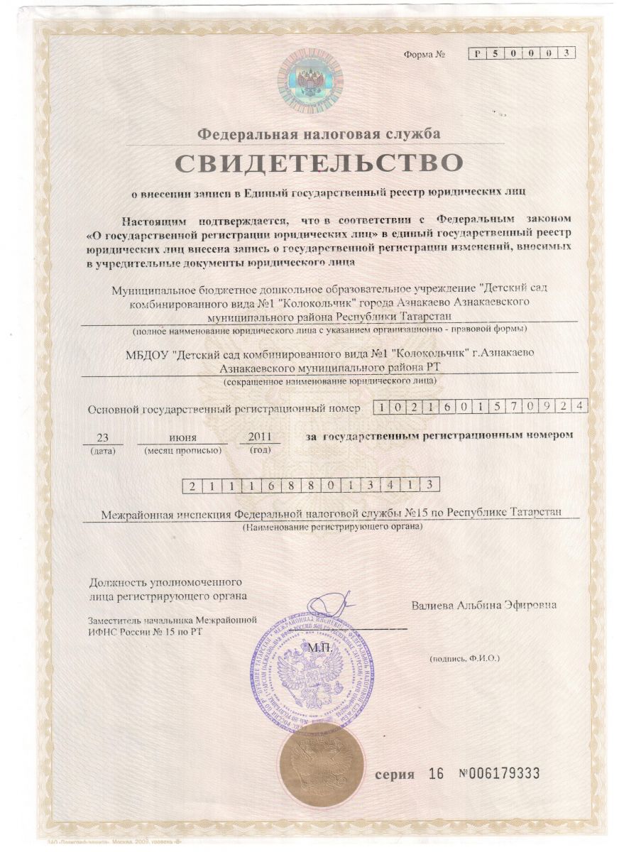 | Короткое название: | МБДОУ "Детский сад комбинированного вида №1 "Колокольчик" г.Азнакаево Азнакаевского муниципального района РТ |