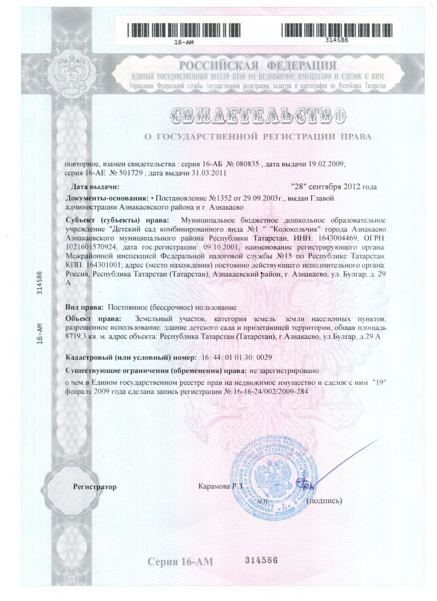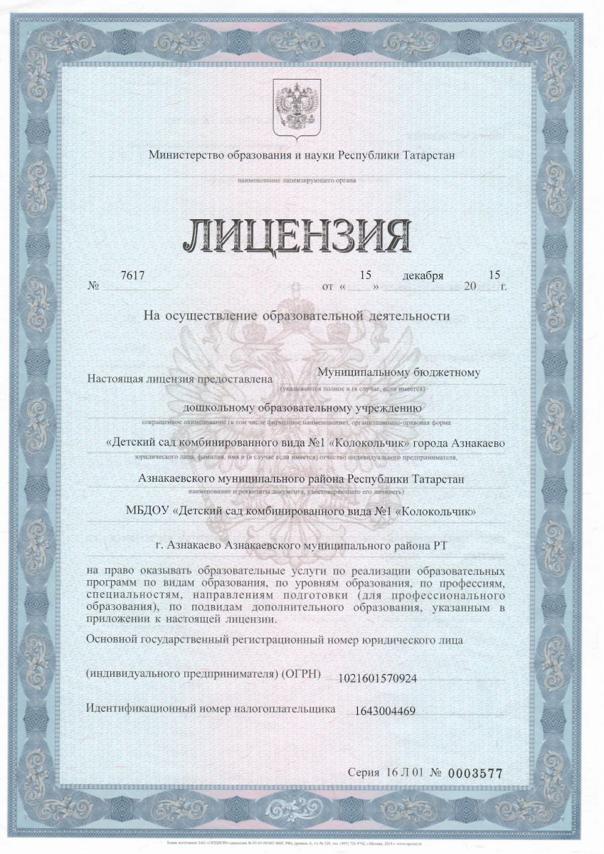 | Короткое название: | МБДОУ "Детский сад комбинированного вида №1 "Колокольчик" г.Азнакаево Азнакаевского муниципального района РТ |