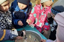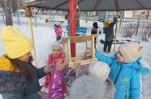 Мы кормушку смастерили.Мы столовую открыли.Воробей, снегирь – сосед,Будет вам зимой обед!В гости в первый день неделиДве синицы прилетели,А во вторник – снегири,Ярче утренней зари!Три вороны были в средуМы не ждали их к обеду.А в четверг со всех краев –Десять жадных воробьевВ пятницу в столовой нашейГолубь лакомился кашей.А в субботу на пирогПрилетело семь сорок.В нашем детском саду стало доброй традицией проведение экологической акции «Кормушка для Чижика».Безнең балалар бакчасында «Чижик өчен Җимлек " экологик акциясе үткәрү күркәм традициягә әверелде. -
