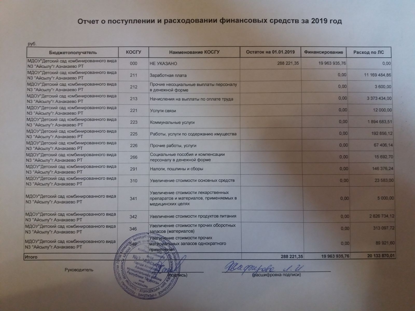 отчет о поступлении и расходовании финансовых средств на 2019 год