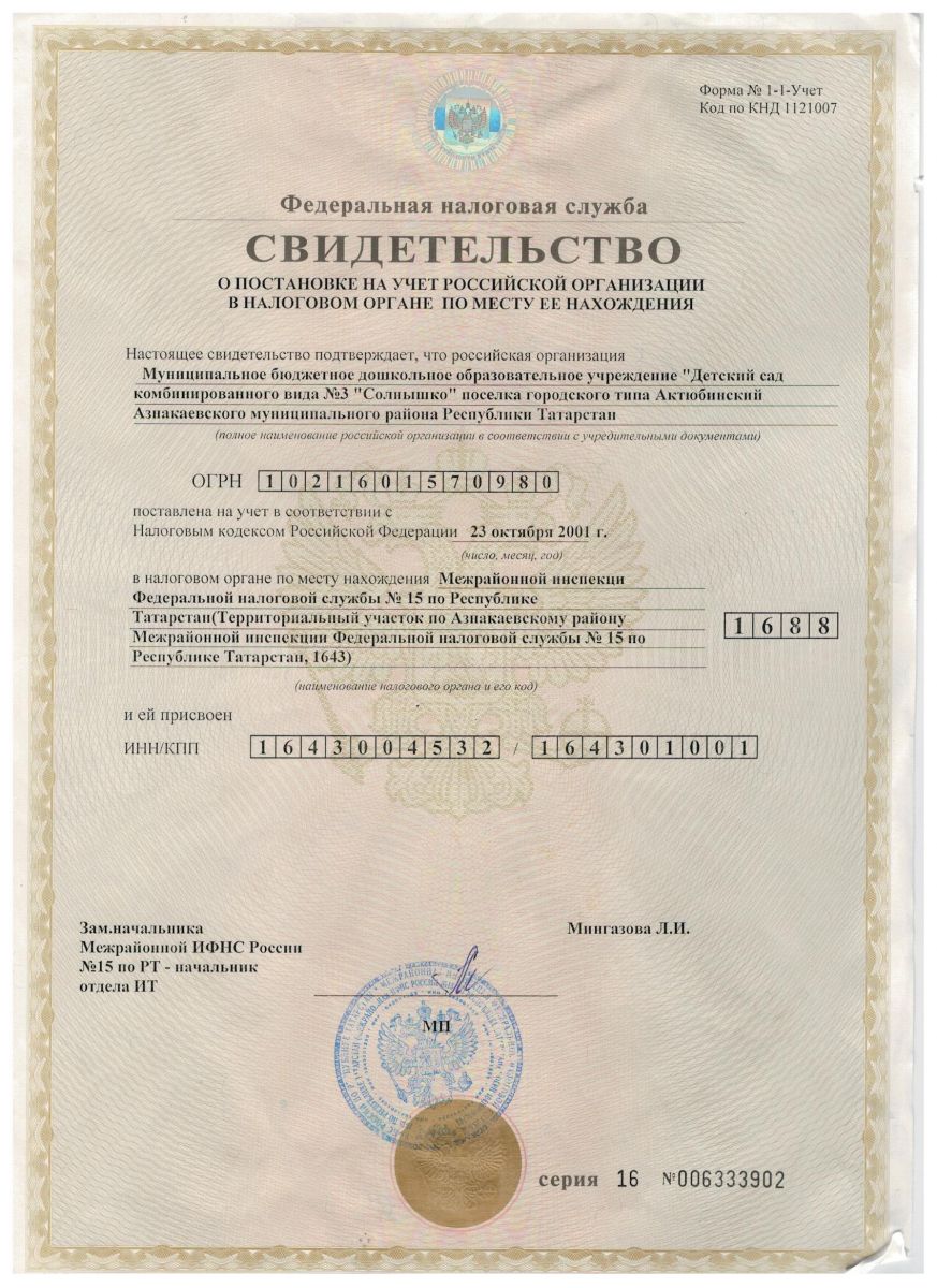 Свидетельство о постановке на учет Российской организации в налоговом органе по месту ее нахождения (ИНН/КПП)