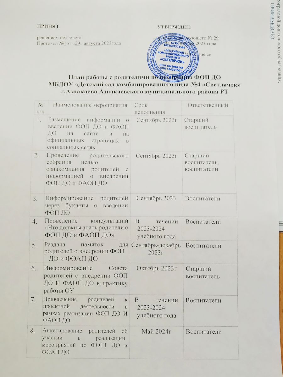 План работы с родителями по внедрению ФОП ДО/ББ ФББП кертү һәм гамәлгә ашыру