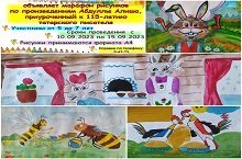 Район балалар китапханәсендә Абддулла Алишның тууына 115 ел тулуга багышланган рәсем ясаучылар бәйгесенә безнең бакчада тәрбияләнүче Сәйфуллин Самат, Рахматуллин Әнвәр, Ибраһимова Язилә, Әхәтов Раделләр үз эшләрен тәкъдим иттеләр. Нәтиҗәләр көтәбез.
