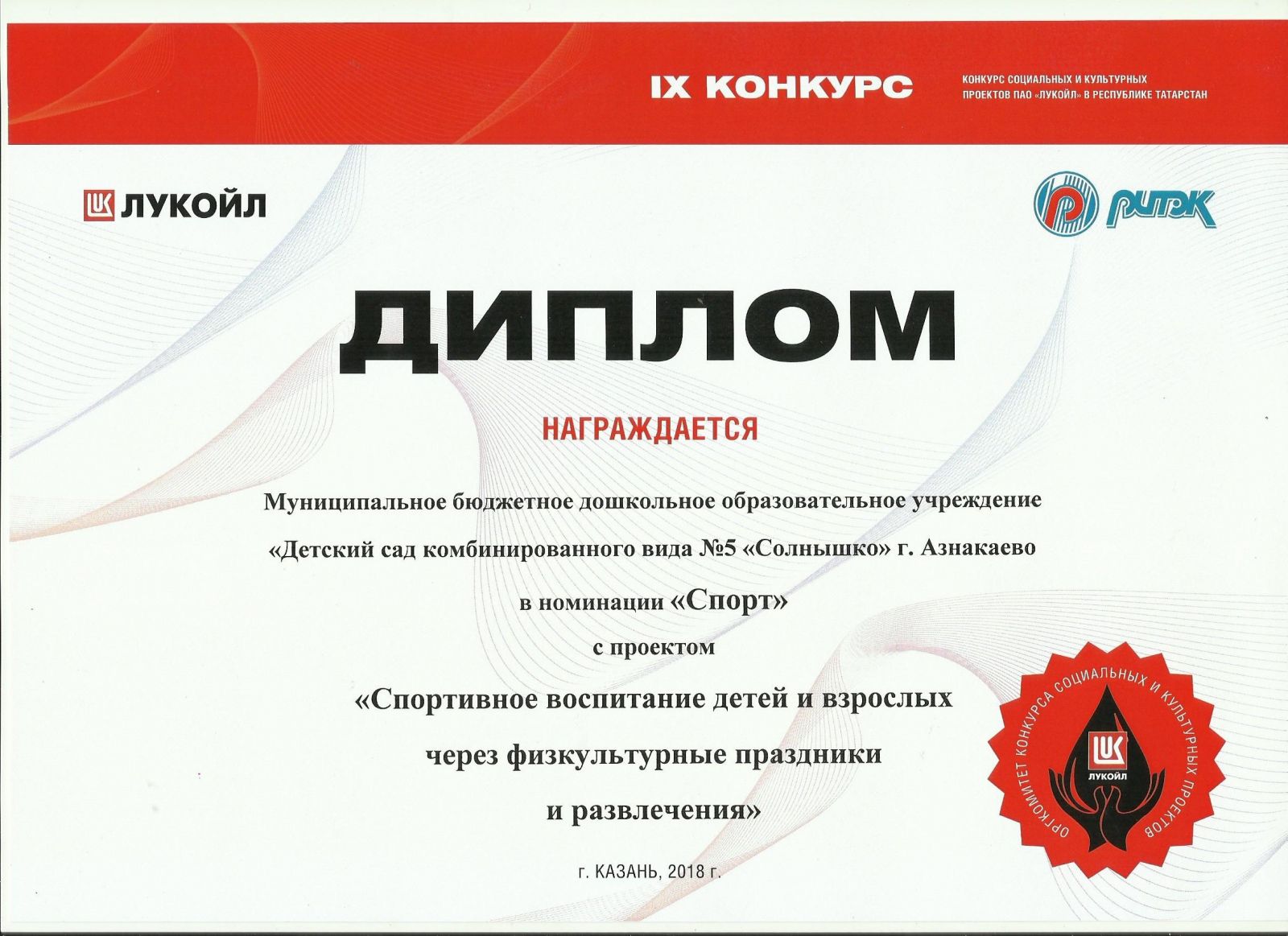 Диплом кокурса социальных и культурных проектов ПАО «ЛУКОЙЛ» в номинации «Спорт». 2018г