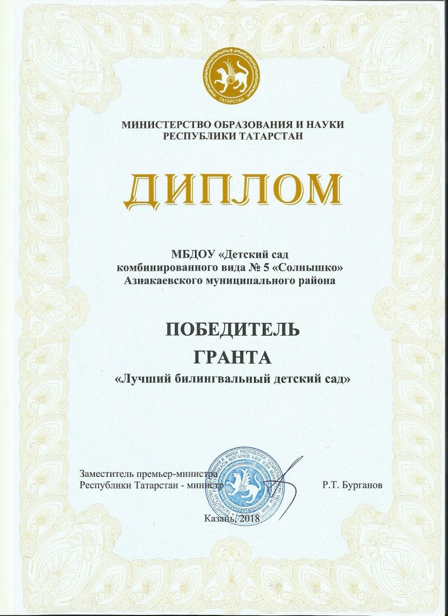 Победитель Гранта "Лучший билингвальный детский сад" 2018г
