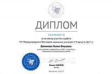 Учитель физики и информатики Даминова Лилия Флусовна награждена дипломом за активное участие в работе VIII Международного фестиваля школьных учителей и получила путевку на участие в IX Международном фестивале школьных учителей. 11.08.2017