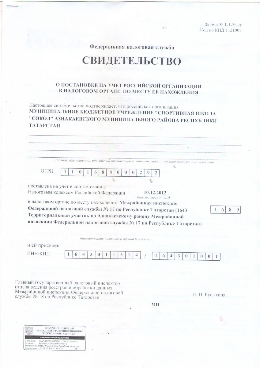 Свидетельство о постановке на учет Российской Организации в Налоговом органе