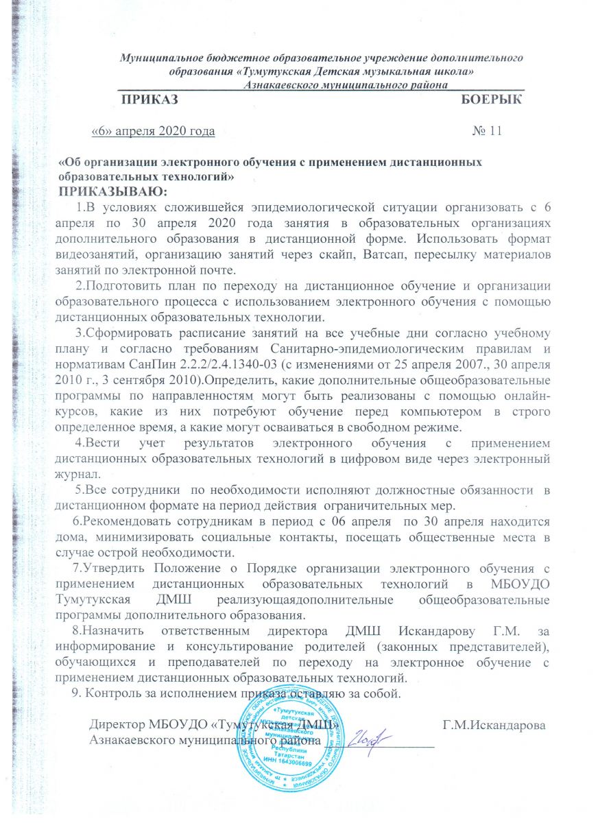 В связи с эпидемиологической обстановкой с 6 апреля МБОУДО "Тумутукская ДМШ" Азнакаевского муниципального района РТ переходит на формат дистанционного обучения.