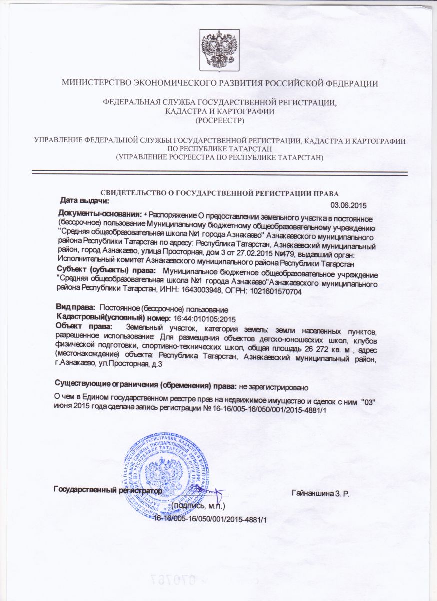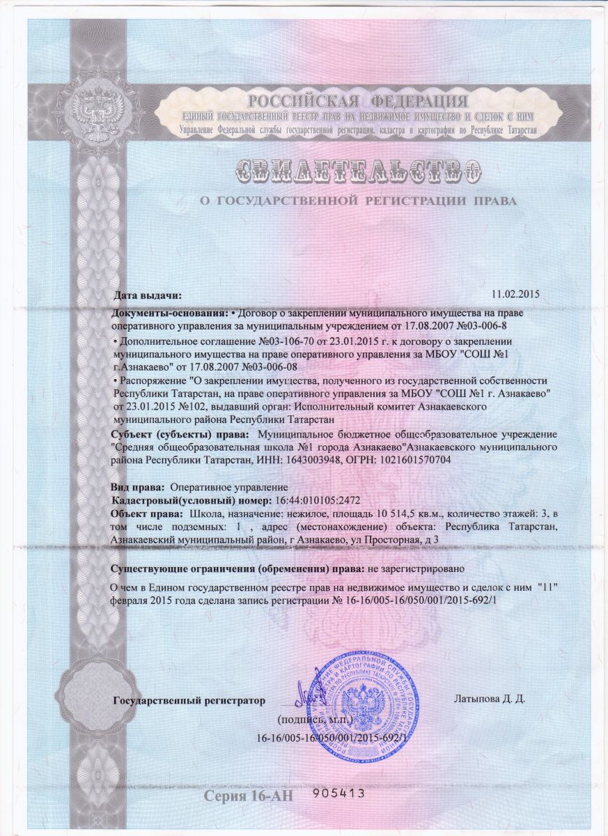Свидетельство о государственной регистрации права/Хокук дәүләт теркәве турында таныклык